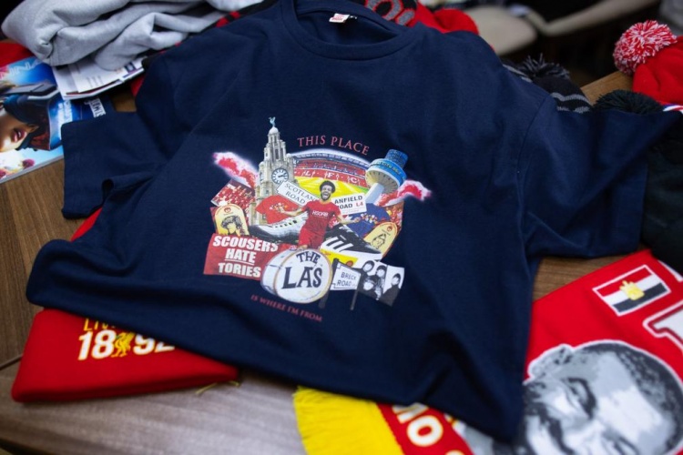 在距離利物浦主場(chǎng)安菲爾德只有5分鐘步行路程的一家商店里,你可以看到當(dāng)?shù)卣诔鍪垡患?0鎊的T恤,上面印有目前利物浦這座城市的標(biāo)志:樂(lè)隊(duì)披頭士和The La's、地標(biāo)性建筑皇家利物大廈和利物浦電臺(tái)城塔,以及薩拉赫。