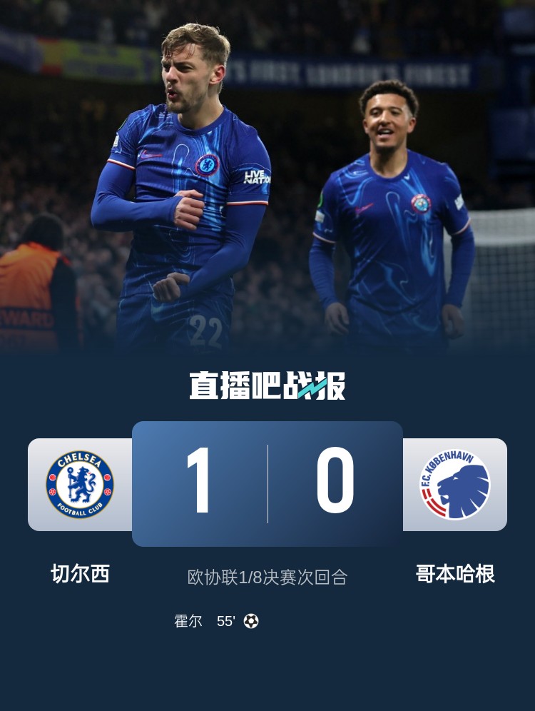 切爾西1-0總比分3-1哥本哈根,晉級歐協(xié)聯(lián)8強階段。