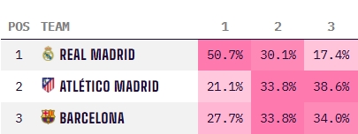 Opta預(yù)測(cè)三強(qiáng)最終分差僅在一場(chǎng)球以內(nèi),皇馬季末預(yù)測(cè)積分為83分,巴薩80-81分,馬競(jìng)80分。