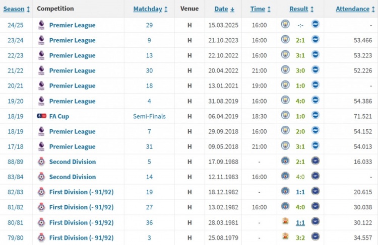 12勝2平,曼城歷史上各項(xiàng)賽事主場(chǎng)對(duì)陣布萊頓未嘗敗績(jī)
