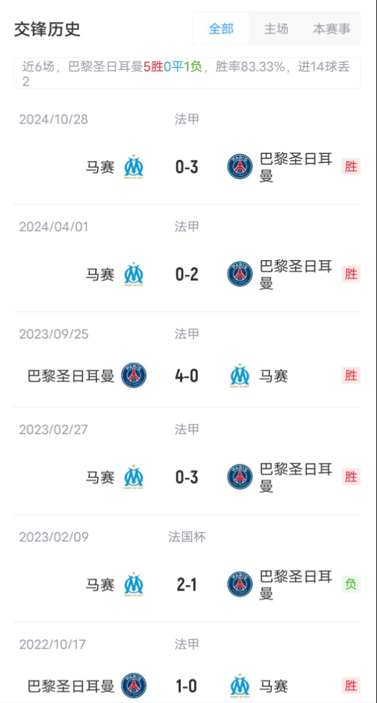 目前法甲聯(lián)賽巴黎取得了20勝5平的成績,積65分高居聯(lián)賽榜首。馬賽取得了15勝4平6負的成績,積49分位居聯(lián)賽第二。