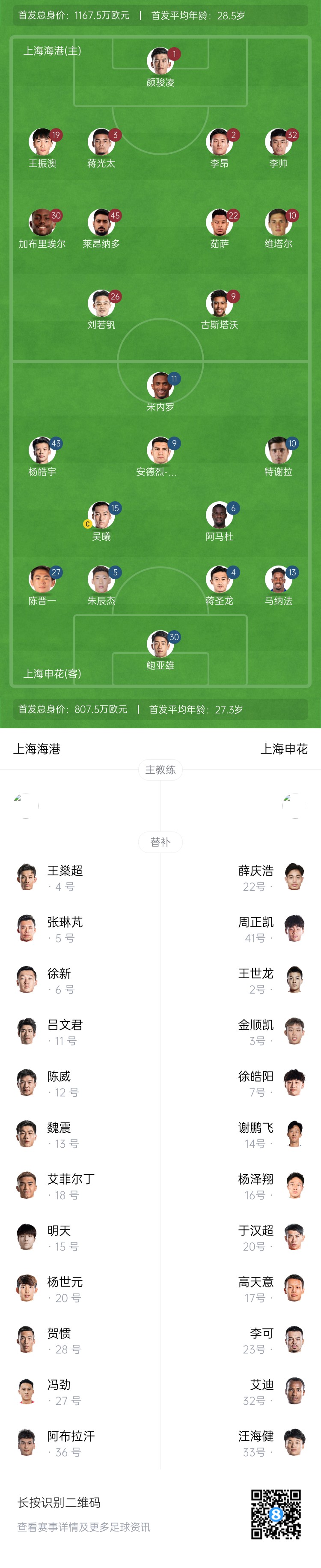 上海申花替補:1-薛慶浩、41-周正凱、2-王世龍、3-金順凱、7-徐皓陽、14-謝鵬飛、16-楊澤翔、17-高天意、20-于漢超、23-李可、32-艾迪、33-汪海健
