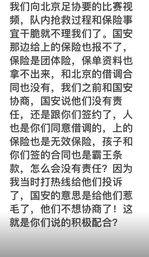 國安那邊給上的保險也報不了,保險是團體險,保單資料也拿不出來,和北京的借調(diào)合同也沒有,我們之前和國安協(xié)商,國安說他們沒有責任,還是跟你們簽約了,人也是你們同意借調(diào)的,上的保險也是無效保險,孩子和我們向北京足協(xié)要的比賽視頻,隊內(nèi)搶救過程和保險事宜干脆就不理我們了。國安那邊給上的保險也報不了,保險是團體險,保單資料也拿不出來,和北京的借調(diào)合同也沒有,我們之前和國安協(xié)商,國安說他們沒有責任,還是跟你們簽約了,人也是你們同意借調(diào)的,上的保險也是無效保險,孩子和你們簽的合同也是霸王條款,怎么會沒有責任?因為我當時打熱線給他們投訴了,國安的意思是給他們?nèi)敲?,他們不想?yún)f(xié)商了!這就是你們說的積極配合?