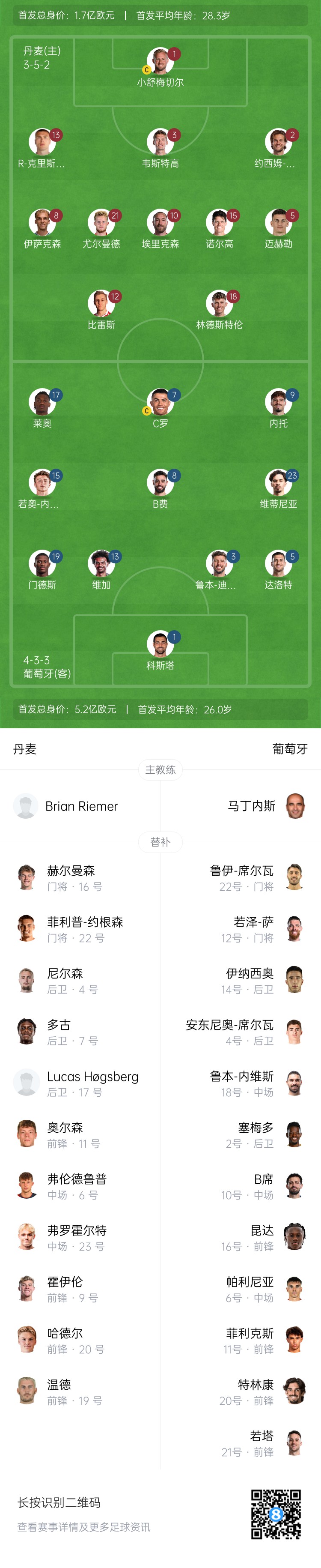 3月21日訊 北京時(shí)間03:45,歐國聯(lián)1/4賽決賽首回合,葡萄牙客場挑戰(zhàn)丹麥。賽前官方公布了雙方的首發(fā)名單。