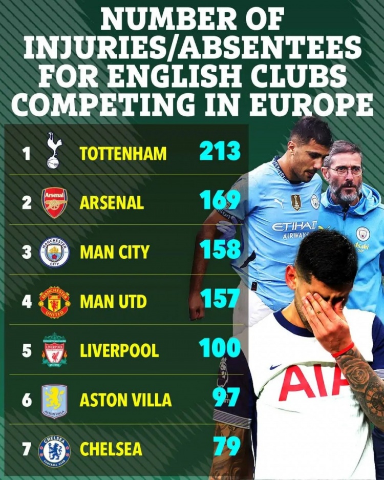 據(jù)統(tǒng)計(jì),熱刺傷病比本賽季參加歐戰(zhàn)的任何英超球隊(duì)都要嚴(yán)重25%。在39場(chǎng)比賽中,熱刺總?cè)毕舜芜_(dá)到213人次,比排名第二的阿森納多出44人。