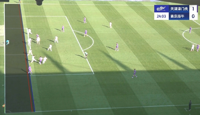 比賽第23分鐘,巴頓禁區(qū)內(nèi)抽射破門,隨后VAR介入,判罰阿代米在接應(yīng)王秋明傳球時(shí)越位在先,進(jìn)球無效。場上比分仍為津門虎1-0海牛。