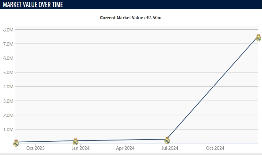 勞爾-阿森西奧本賽季才進(jìn)入皇馬一線隊,至今代表球隊出場21次,在西甲送出過一記助攻。值得一提的是,這位小將在連續(xù)兩場硬仗中都首發(fā)出場,球隊1-1戰(zhàn)平馬競、3-2戰(zhàn)勝曼城。目前球員德轉(zhuǎn)身價僅為750萬歐元。