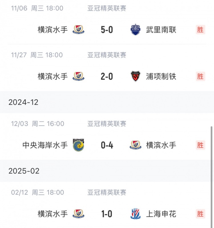 橫濱水手近4輪亞冠精英聯(lián)賽成績(jī)↓↓↓