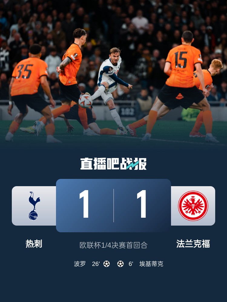 ?;倏耸组_紀(jì)錄,波羅扳平比分,最終熱刺首回合1-1戰(zhàn)平法蘭克福。