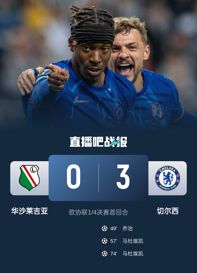 馬杜埃凱梅開二度,桑喬2助,切爾西客場(chǎng)3-0戰(zhàn)勝華沙萊吉亞。