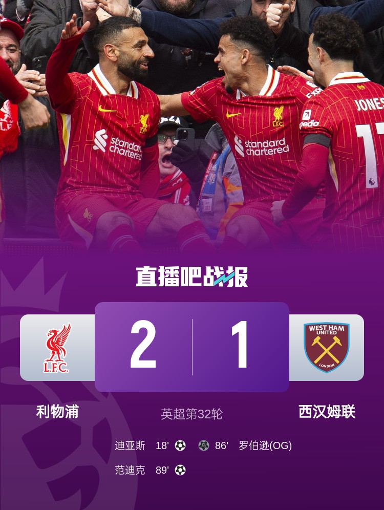 薩拉赫助攻路易斯-迪亞斯破門,范迪克建功,最終利物浦2-1西漢姆,13分領(lǐng)跑積分榜。