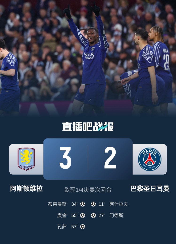歐冠1/4決賽次回合,巴黎客場2-3維拉,總比分5-4驚險晉級4強。上半場,阿什拉夫破門,努諾-門德斯再下一城,蒂萊曼斯扳回一球;下半場,麥金遠射,拉什福德邊路強行爆破,助攻孔薩破門,阿森西奧錯失扳平良機,多納魯馬多次關鍵神撲。