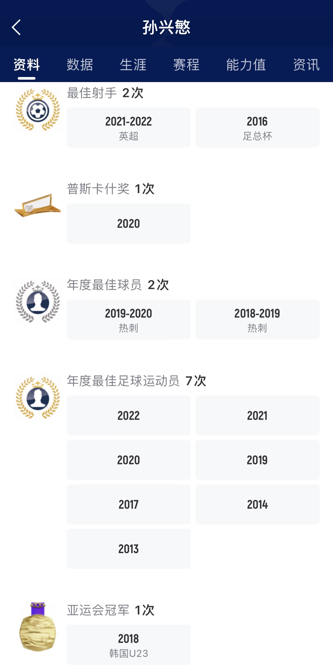 孫興慜2010年代表漢堡首次出戰(zhàn)職業(yè)聯(lián)賽,2013加盟勒沃庫(kù)森,2015年加盟熱刺,俱樂(lè)部層面尚未贏得任何冠軍榮譽(yù)。