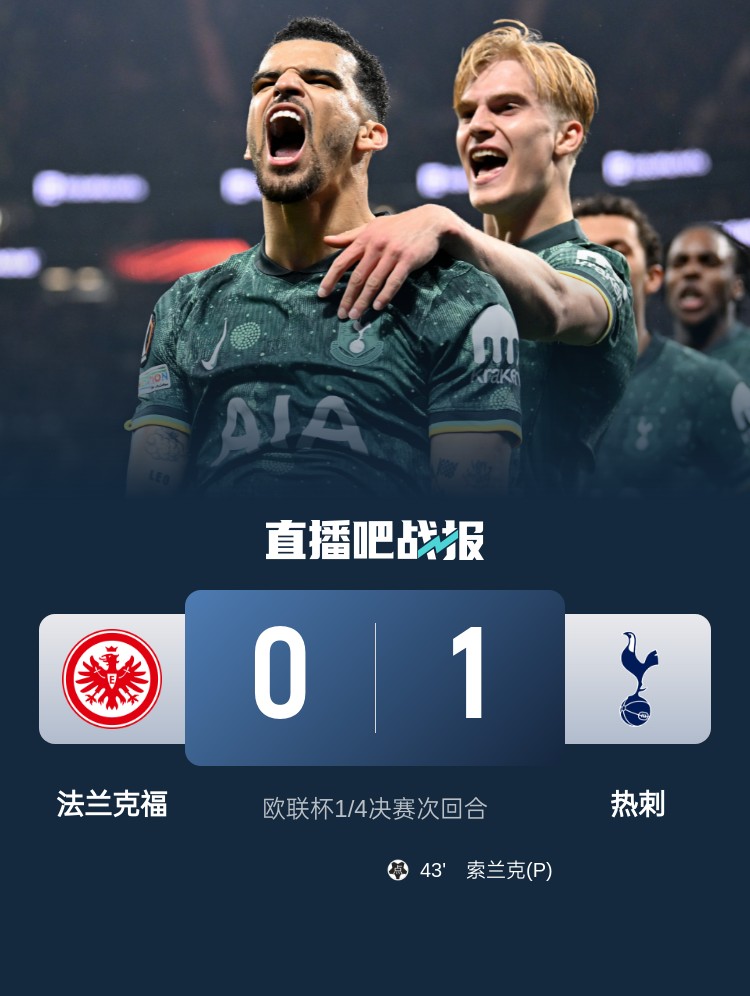 索蘭克點(diǎn)射建功,最終熱刺1-0客勝法蘭克福,總比分2-1晉級(jí)四強(qiáng)。