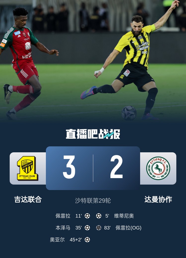 沙特聯(lián)-吉達聯(lián)合3-2達曼協(xié)作6分領跑 本澤馬傳射佩雷拉破門+烏龍