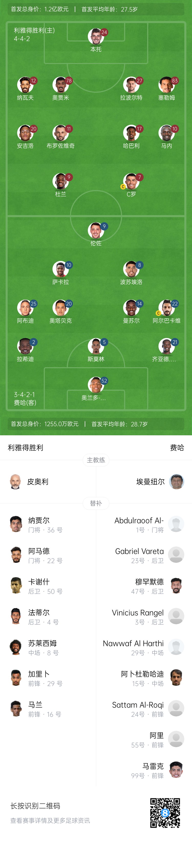 利雅得勝利首發(fā):24-本托、12-布歇爾、78-拉賈米、27-拉波爾特、83-納伊迪、17-海巴里、11-布羅佐維奇、20-安吉洛、10-馬內(nèi)、9-杜蘭、7-C羅