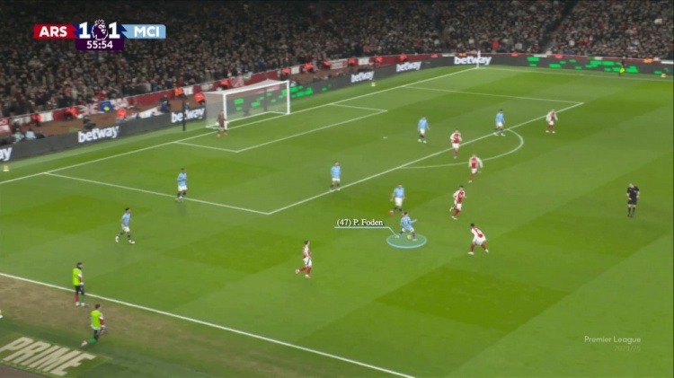 福登、薩維尼奧,再加上曼城的三名中場球員,他們在球門附近有太多的球員,使得他們很難長傳球調度(哈蘭德在中線附近,沒有出現(xiàn)在這個鏡頭中)。