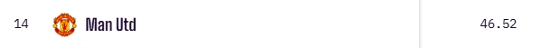 數據機構Opta最新的預測結果顯示,曼聯(lián)本賽季最終可能拿到46-47個積分,預計排名聯(lián)賽第14。