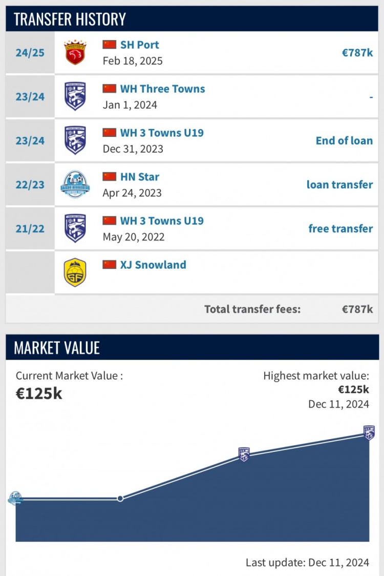 在吾米提江的個(gè)人頁(yè)面顯示,他已于2月18日加盟上海海港,轉(zhuǎn)會(huì)費(fèi)78.7萬歐元(約合600萬人民幣),不過合同年限暫未披露。目前,吾米提江的個(gè)人身價(jià)為12.5萬歐元。