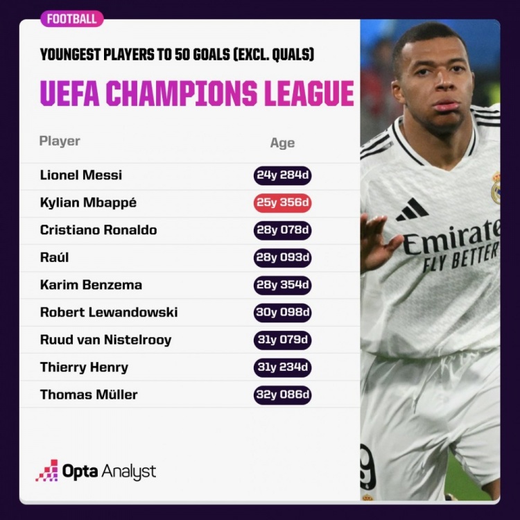 首回合對(duì)皇馬哈蘭德打進(jìn)兩球,將個(gè)人歐冠進(jìn)球數(shù)提升至49球,如果次回合哈蘭德再度攻破皇馬球門,那他將以24歲213天的年齡,成為最快達(dá)成歐冠50球的球員。