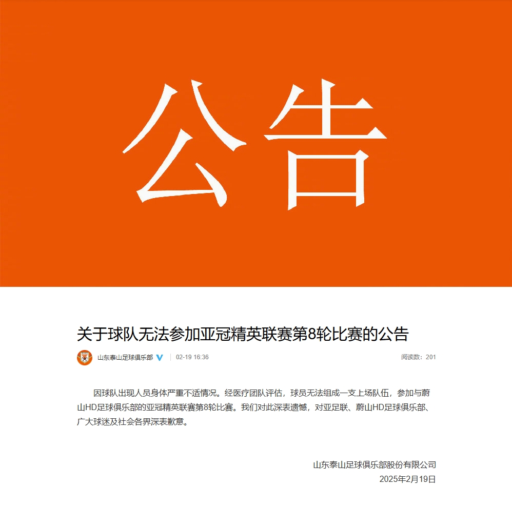 02月19日訊 山東泰山官方就退出今晚的亞冠比賽發(fā)布聲明。