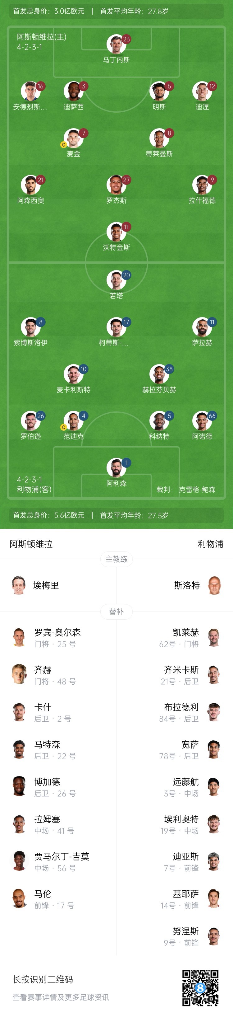 維拉首發(fā):23-馬丁內(nèi)斯、16-加西亞、3-迪薩西、5-明斯、12-迪涅、21-阿森西奧、8-蒂萊曼斯、7-麥金、9-拉什福德、27-羅杰斯、11-沃特金斯