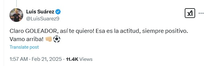 蘇亞雷斯表示道:“你當(dāng)然還是進(jìn)球的射手,我很愛你!你要永遠(yuǎn)保持積極向上的態(tài)度,繼續(xù)加油吧!??????????”